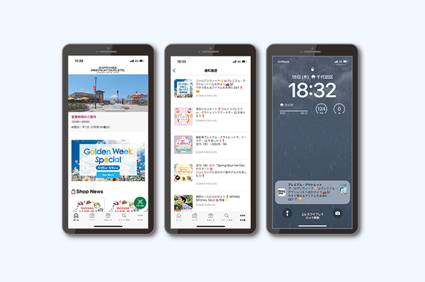 プレミアム・アウトレットアプリを通して、お客様向けにPUSH通知(100字程度)を送信いただけます。