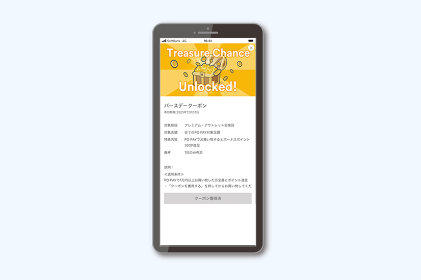 - PO PAYの特典配信サービス「Treasure Chance」を利用して、会員様にクーポンを配信いただけます。