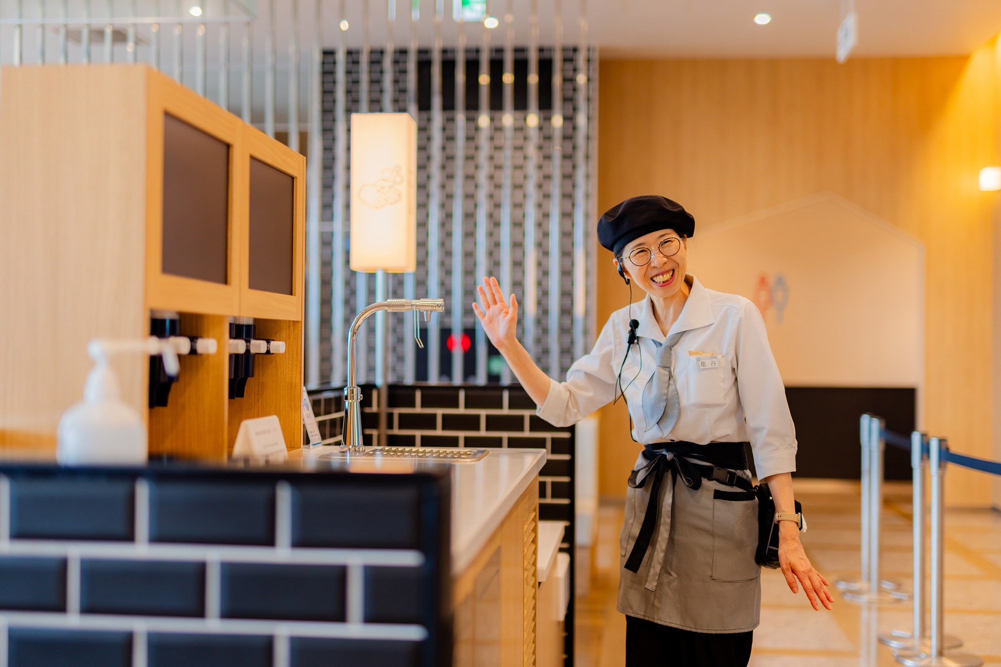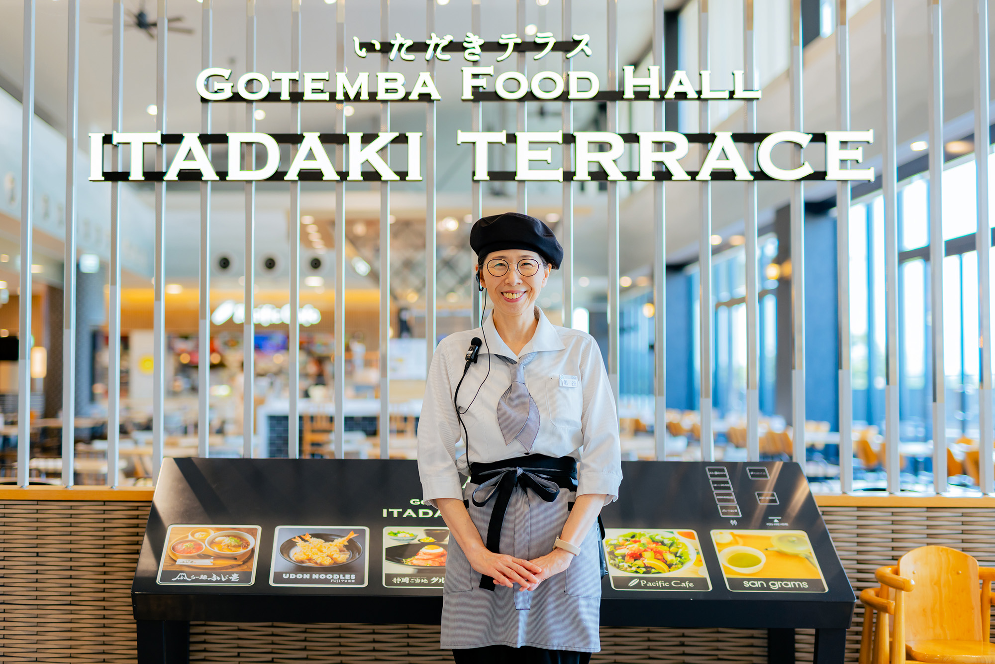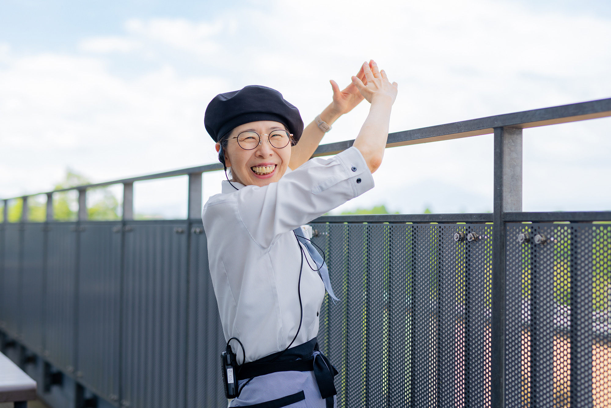 両腕をグッと伸ばして富士山の形を作りながら、仕事のやりがいについて話してくれたのは、ヒルサイドエリアのフードコート「いただきテラス」のホールで働く亀谷由紀乃(かめたに ゆきの)さん。