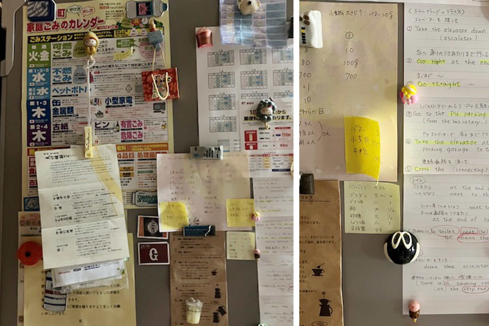 「英語が得意ではないのですが、よく聞かれる質問に答えるためのフレーズを調べて覚えるようにしています。長い文章にしてしまうと伝わりづらいので、子どもが話すような『お腹が空いた』『ジュースが飲みたい』といった短い言葉を、翻訳アプリなどで調べてメモしています。たとえば“ホテルに行くためには屋上まで上がる”という表現を調べてメモを作ったら、毎日目にする“家の冷蔵庫”に貼って覚えるんです。今はバンバンジーのレシピと一緒に、英語のフレーズが貼ってあります」