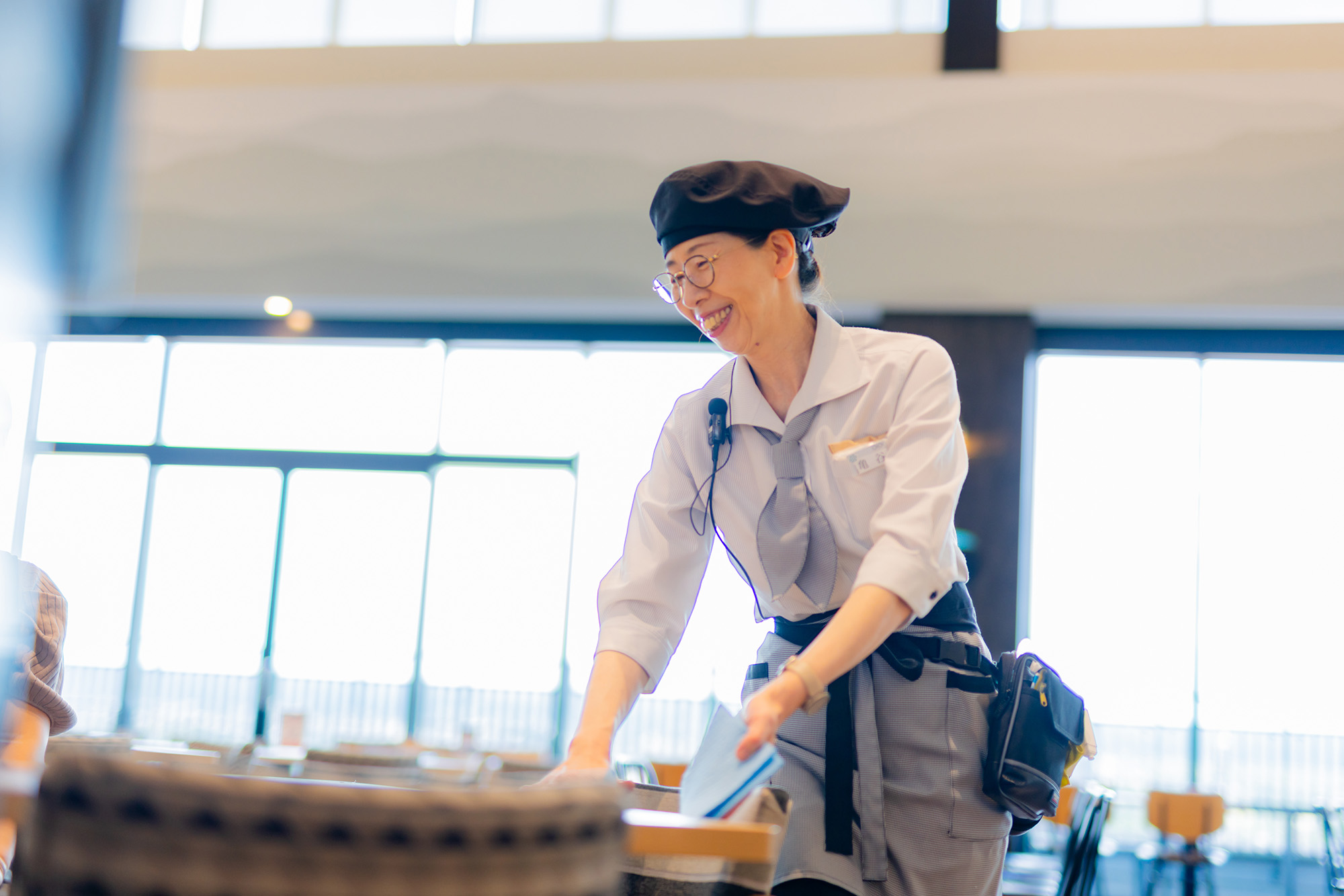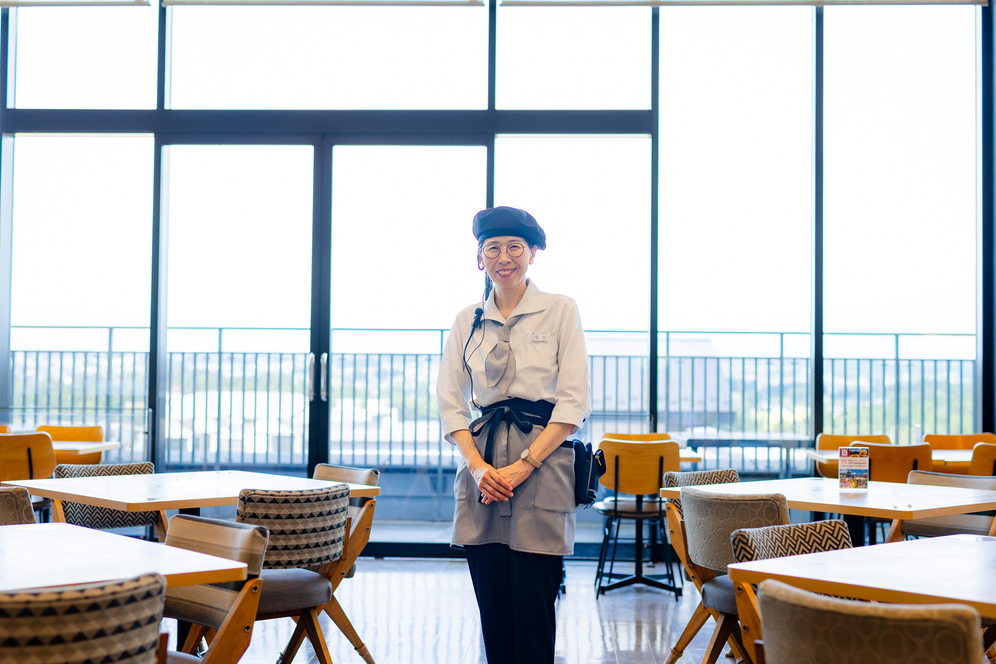 2020年6月。ヒルサイドエリアのオープン直後から「いただきテラス」のホールで働き始めた亀谷さん。“お掃除メインではない”という心構えは理解しながらも、約20年ぶりの接客に不安を抱えながらのスタートでした。