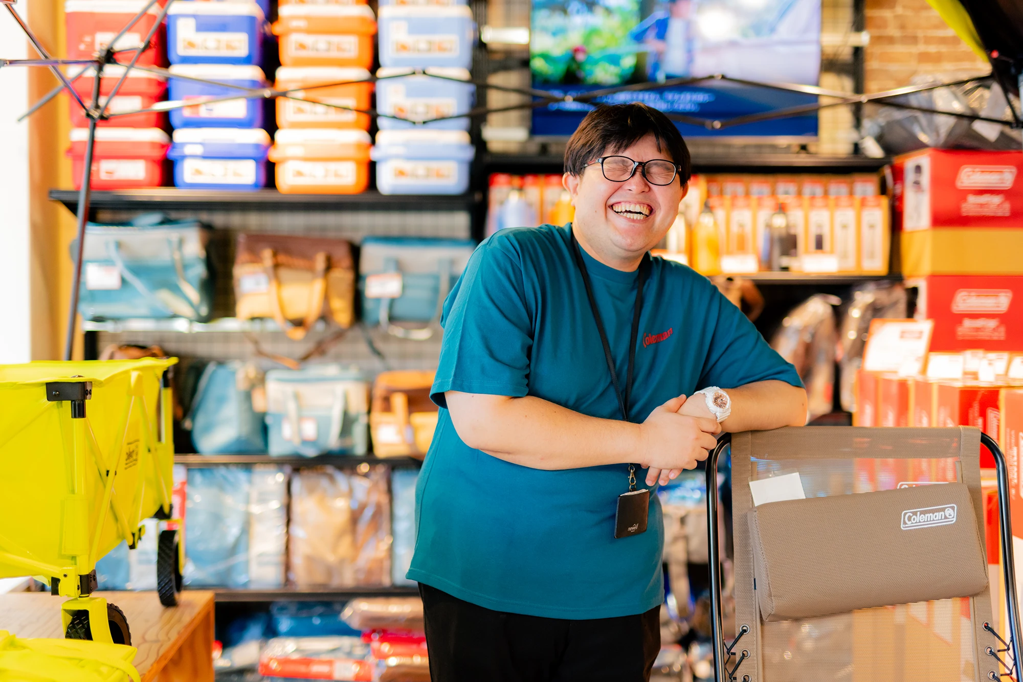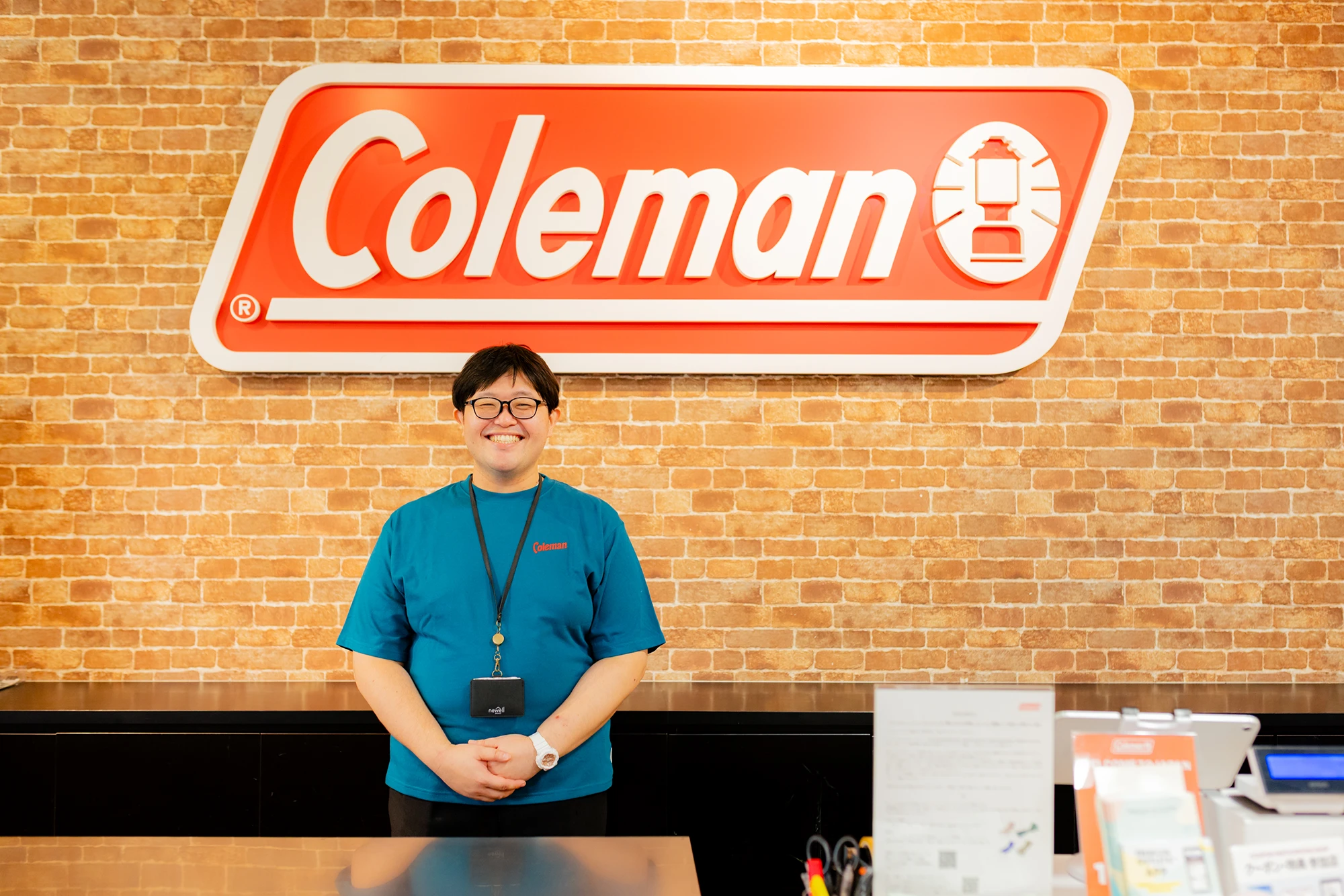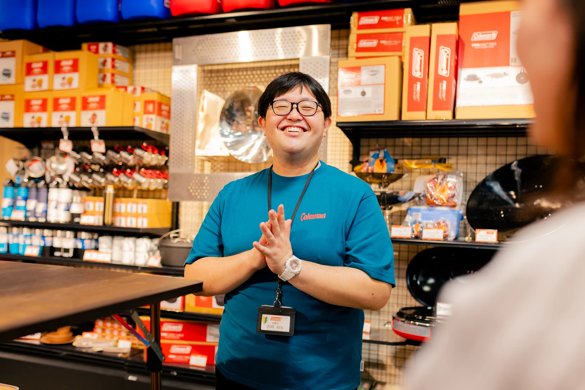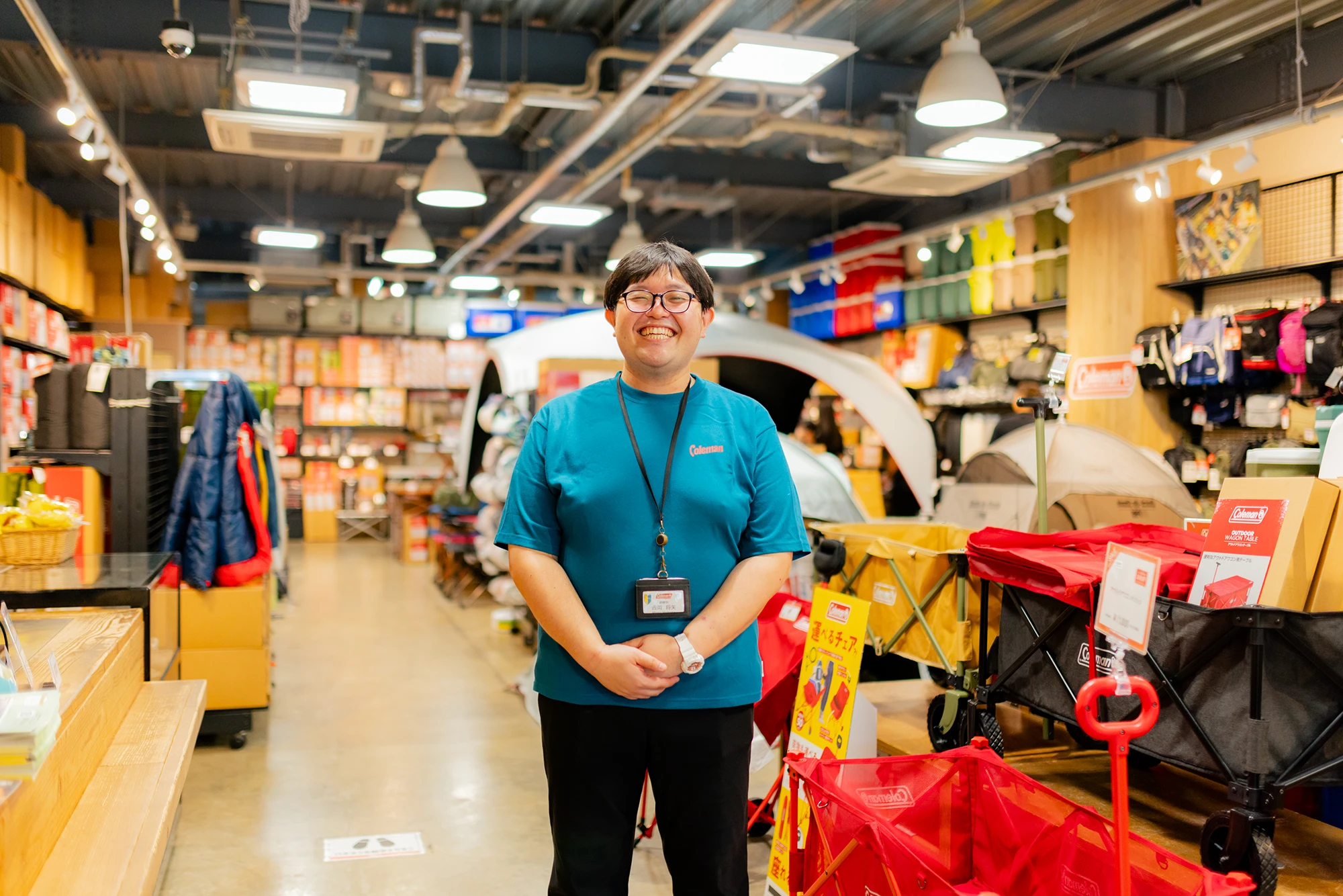 どこか“夢の国”のキャラクターを彷彿とさせる、見る人を包み込むような優しい笑顔。吉岡将矢(よしおか しょうや)さんは、テントやランタンをはじめとしたアウトドア用品全般を扱う人気ブランド「コールマン」で働く店舗スタッフです。