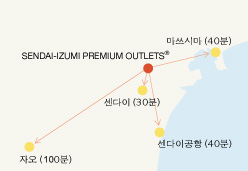 Sendai-Izumi Premium Outlets®는 일본의 북쪽에 있는 도호쿠·센다이시에 위치하며, 녹음이 풍부한 '숲의 거리'로 펼쳐진 '이즈미 파크타운'입니다. 부근 관광지로는 온천과 스키장으로 유명한 자오와 일본 3경으로서 아름다운 경치가 펼쳐져 있는 마쓰시마, 규탕(소혀구이)요리로도 유명한 센다이 시내가 자리해 있습니다. 센다이공항에서는 40분으로 가깝고, 센다이와 히가시마쓰시마 등까지는 1시간 이내, 자오까지도 1시간 반 이내에 이동할 수 있습니다.