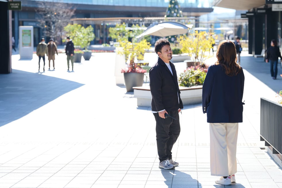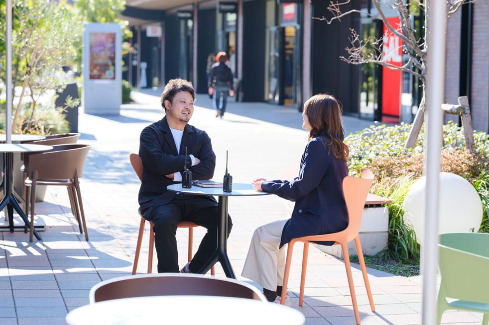 転職を考えた時に思い浮かんだのは、一顧客として当社のアウトレットを訪れた時のこと。新たな商品との出会いはもちろん、開放的な空間でのショッピングや、アウトレットに向かう道中のワクワク感まで、特別な体験として心に残っていて、今度は自分がつくり手側に回ってみたいと思うようになったんです。また、郊外での生活にも惹かれましたね。ずっと都心部に住んできたからこそ、知らない土地に住むのも自分にとっていい経験になるんじゃないかと思って。実際、車通勤が基本になり、満員電車に乗らなくていいのもうれしいポイントでした。