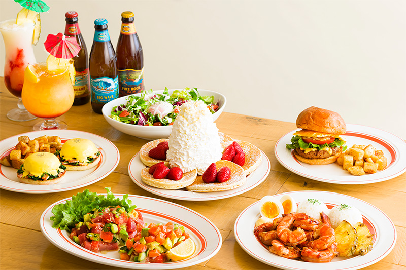 ゆったりとした時が流れる、居心地の良いハワイアンリビングのような店内では、ハワイならではの朝食であるパンケーキやエッグベネディクトなどはもちろん、ガーリックシュリンプやアヒポケなど本場ハワイの味わいを楽しめるロコフードも豊富にお楽しみいただけます。